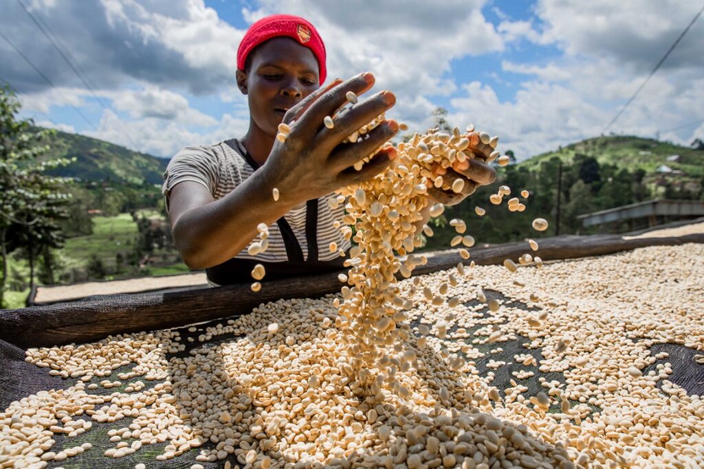 Eine Hingakawa Frau, die gerade den Kaffee in der Sonne trocknen lässt. (Bild: https://abakundakawa.rw/)